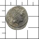 Kopf der Roma mit Greifenhelm nach r. Dahinter ein Kontrollzeichen.